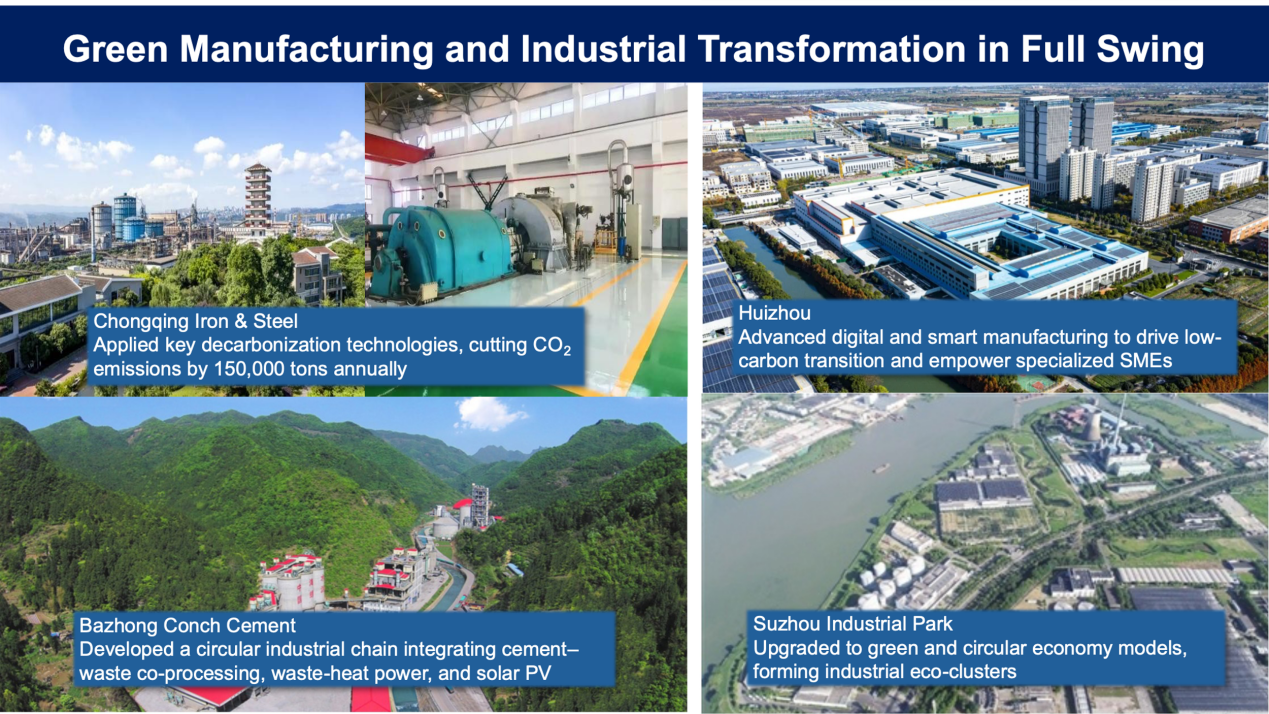 报告梳理了中国在交通电动化和产业低碳发展方面的突出成就。截至2025年中,中国新能源车保有量已达3689万辆,新能源汽车出口正从“产品出海”向“产业链出海”迈进。中国为全球提供80%以上的光伏组件和70%的风电装备,推动全球风电、光伏发电项目的平均度电成本,10年来分别累计下降超过60%和80%。报告还系统介绍了中国在低碳制造、绿色物流、绿色建筑、非二氧化碳温室气体排放控制,以及提升生态系统碳汇能力等方面的进展与成功案例。