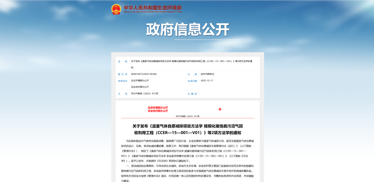 为深入贯彻落实《中共中央办公厅 国务院办公厅关于推进绿色低碳转型加强全国碳市场建设的意见》,生态环境部正式印发《温室气体自愿减排项目方法学 规模化猪场粪污沼气回收利用工程》《温室气体自愿减排项目方法学 农业废弃物集中处理工程》(环办气候函〔2025〕473号)两项方法学(以下简称“两项方法学”),对规模化猪场粪污沼气回收利用、农业废弃物集中处理工程甲烷回收两类自愿减排项目的适用条件、项目边界、减排量核算、监管审定等方面作出明确规范。