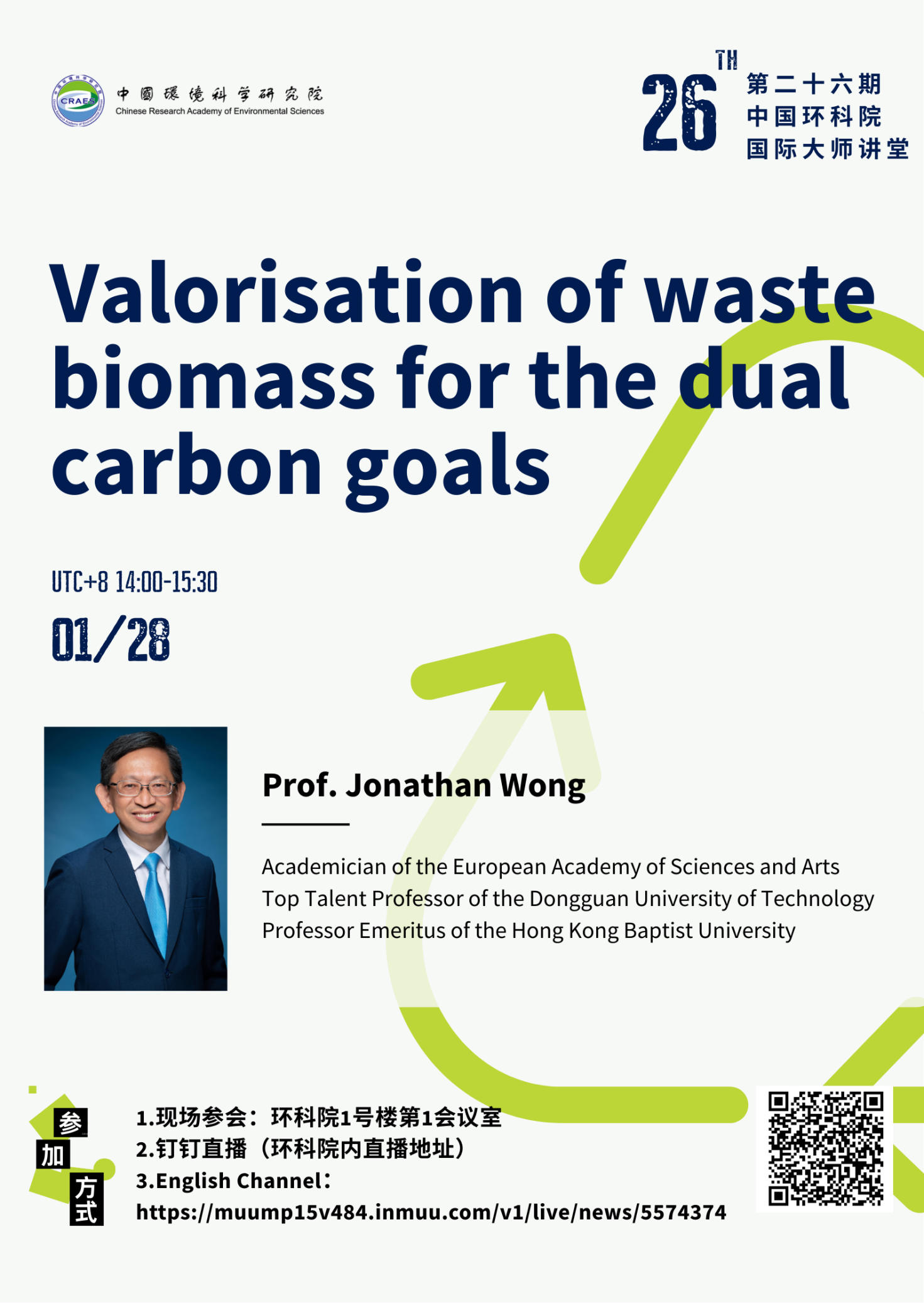 本期讲堂,黄焕忠教授将作“Valorisation of Waste Biomass for the Dual Carbon Goals”的报告,重点阐述废弃生物质通过高值化循环利用技术推动资源再生与碳减排的路径。报告将从环境科学与循环经济交叉视角,探讨如何通过技术创新与系统优化助力“双碳”目标的实现。