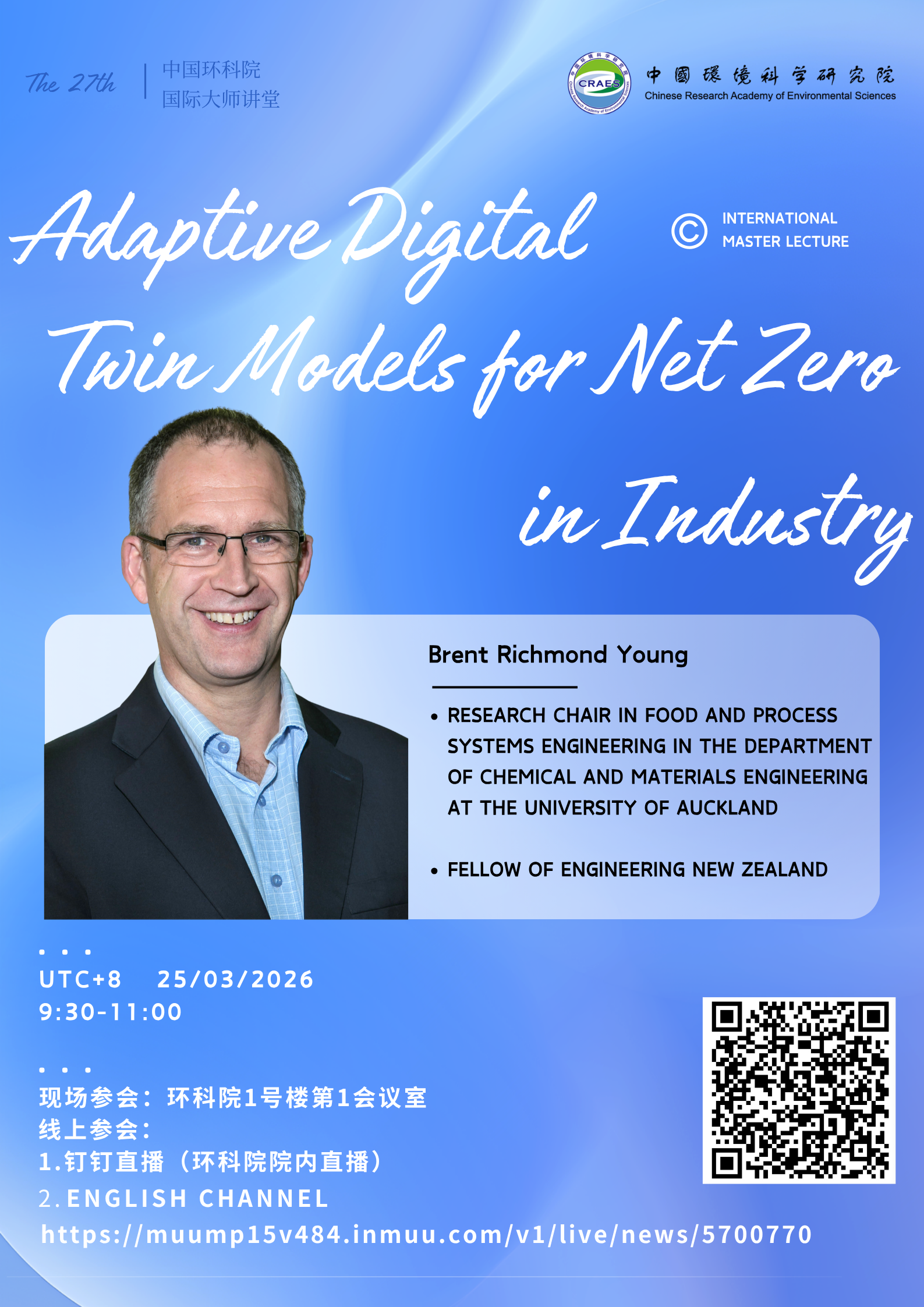 本期讲堂,Brent Richmond Young教授将作“Adaptive Digital Twin Models for Net Zero in Industry”的报告,重点阐述自适应数字孪生模型在实现净零目标中的最新国际研究进展与应用路径,对于开展复杂环境过程智能化调控、污染治理设施数字孪生平台构建等具有重要参考价值。